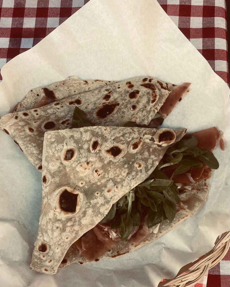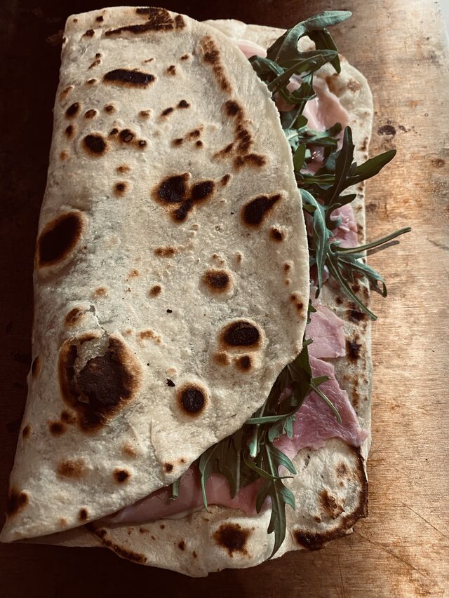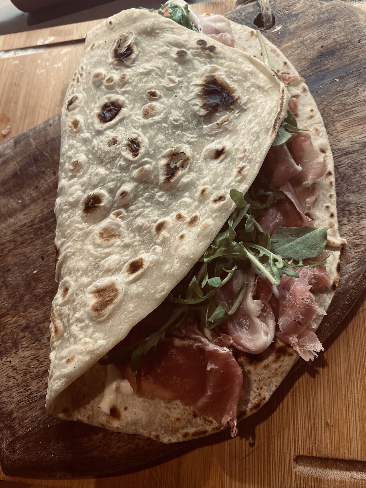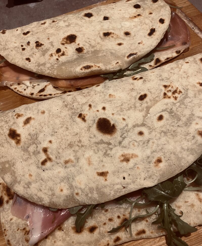 La PIADINA ou CRESCIONE (version chausson) est une galette souple et croustillante faite à base de farine et de saindoux cuite sur une plaque, garnie de charcuterie , légumes et fromages italiens.