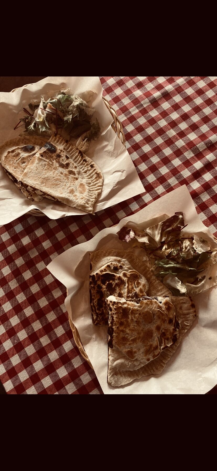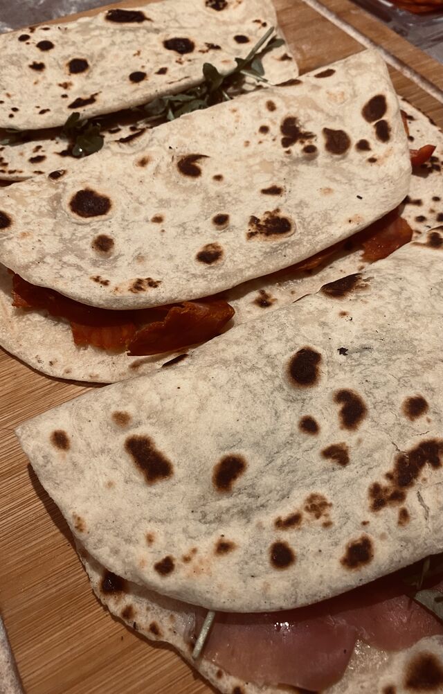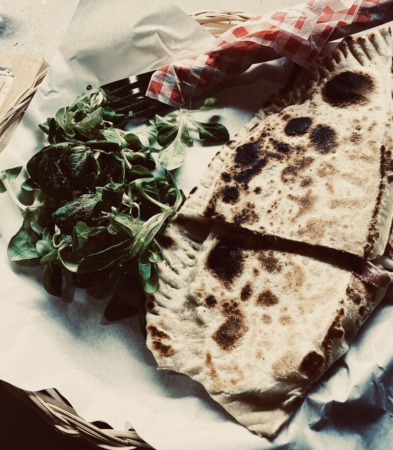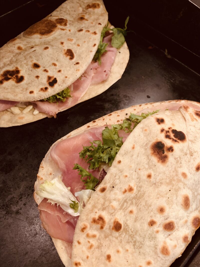 La PIADINA ou CRESCIONE (version chausson) est une galette souple et croustillante faite à base de farine et de saindoux cuite sur une plaque, garnie de charcuterie , légumes et fromages italiens.